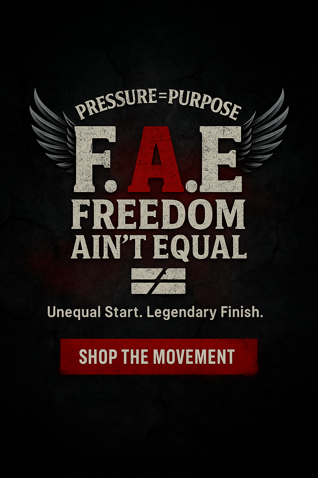 Every legend starts in the dark — under pressure, under doubt, under weight.This piece represents the transformation that happens when you don’t fold.When the world applies pressure, you shape it into purpose.The red arrow stands for motion — forward, no matter how heavy it gets.The distressed white letters remind you that every crack and flaw is proof of survival, not weakness.F.A.E. (Freedom Ain’t Equal) isn’t about perfection — it’s about perseverance.It’s about turning struggle into strength and setbacks into symbols.Because purpose is born in pressure — and only those who’ve felt it understand its value.Built for those who carry the weight and still rise.PRESSURE → PURPOSE. F.A.E. — Built from Struggle.